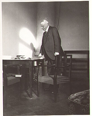 Kokovartalokuva: Edvard Westermarck seisoo pöydän ääressä puoliprofiilissa tuolin takana ja kaakeliuunin edessä.