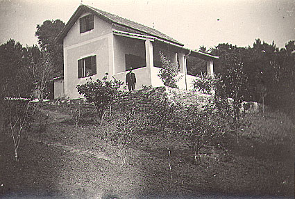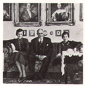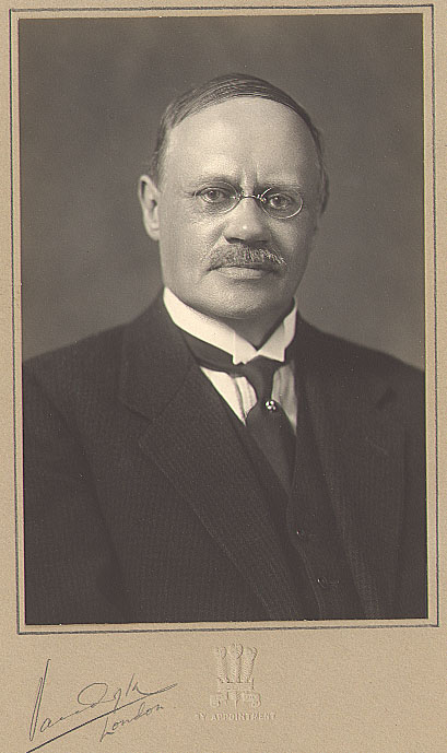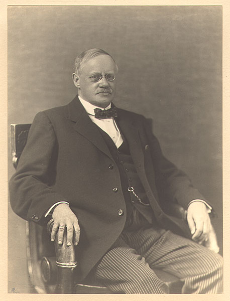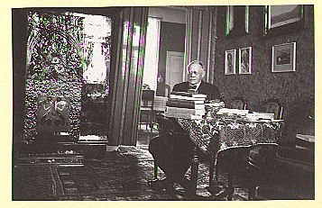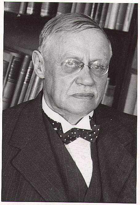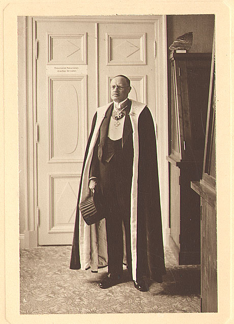 Ryhmämuotokuva: Edvard Westermarck istuu miesten sekä yhden naisen seurassa valkoliinaisen pöydän ääressä. Pöydällä on maljakko kukkineen, seinillä muotokuvia. Katossa roikkuu kristallikruunu.