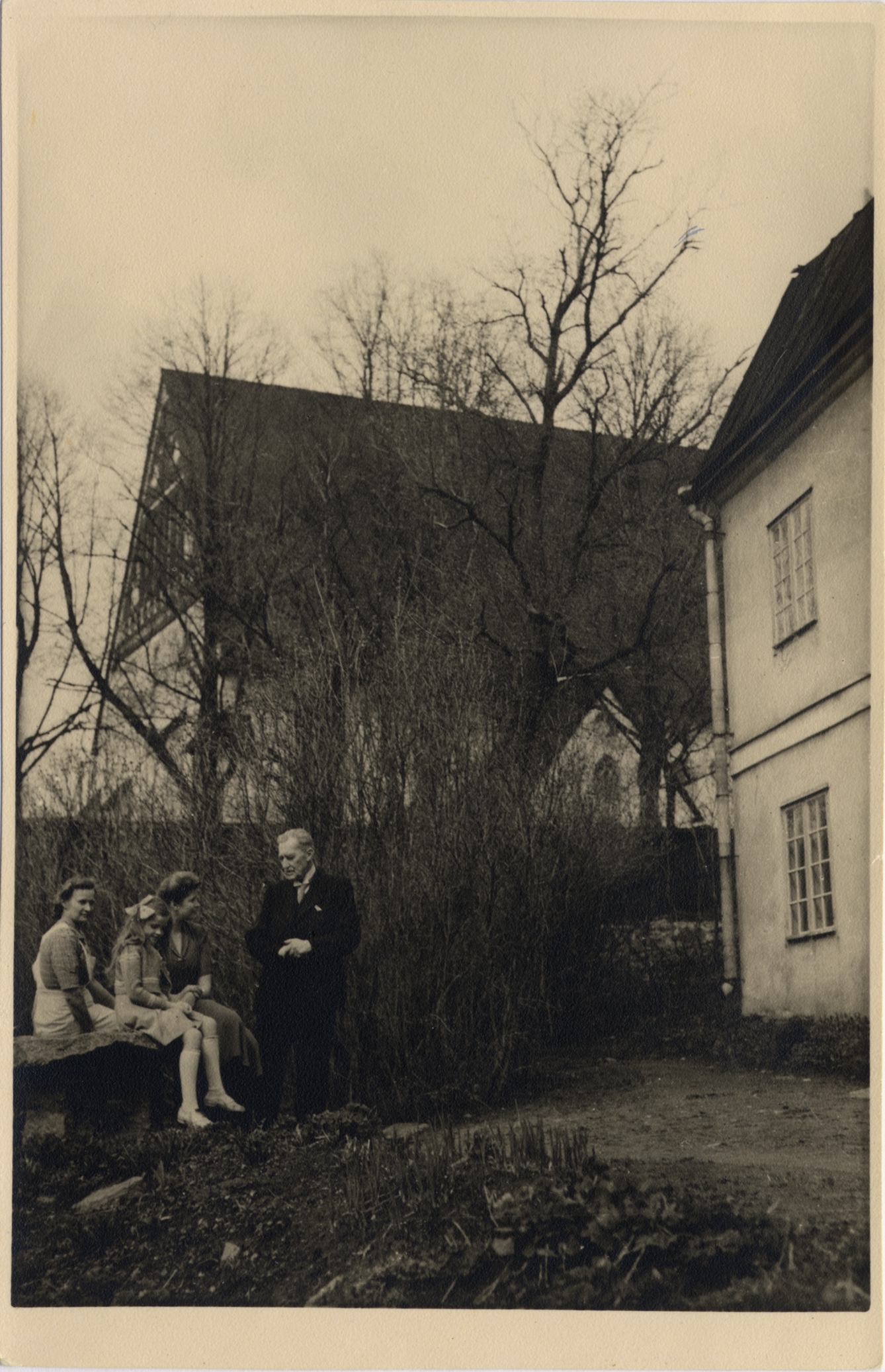 Rolf Lagerborg tyttärensä Susannan, tytärtyttären Veronican ja Elnan kanssa Runoilijatalon edessä.